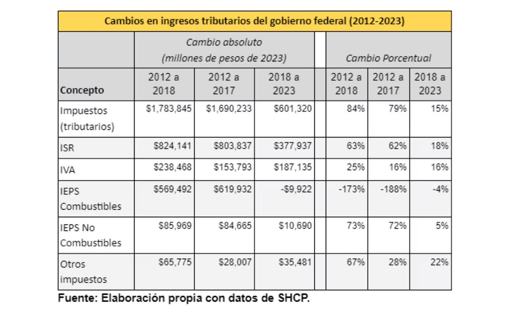 Mientras que en el sexenio de Peña la recaudación por ISR e IVA aumentó en 63 y 25% respectivamente, en el sexenio actual el aumento apenas llegó a 18 y 16%. En el caso del IEPS (en su modalidad dirigida a bienes no combustibles, como tabaco y bebidas alcohólicas y con azúcares y/o alto contenido calórico), el aumento fue de 73% en el sexenio pasado, y apenas alcanzó 5% durante lo que va del actual.