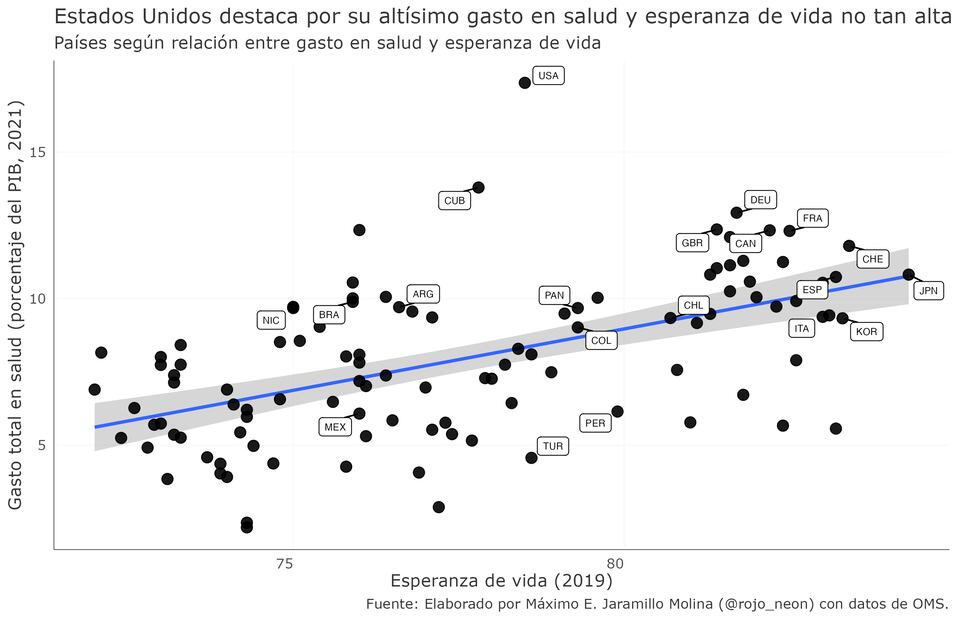 Como pueden observar en la gráfica más abajo, el caso de Estados Unidos es estadísticamente atípico, ya que aunque gastan en total 17% del PIB en salud, su esperanza de vida está muy por debajo de países europeos que gastan mucho menos. De hecho, EUA gasta 7 puntos del PIB más que Japón, país lidera el ranking en esperanza de vida. Incluso países latinoamericanos como Panamá, Perú, Chile y Colombia presentan una mayor esperanza de vida que el caso estadounidense, con un gasto mucho más bajo.